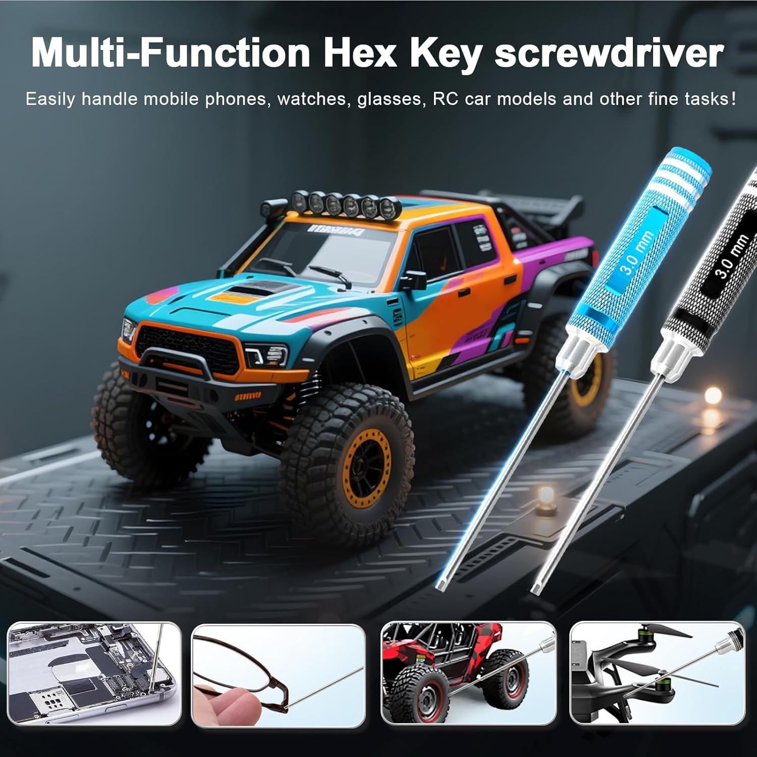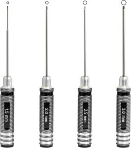 Precision 4-Piece 1.5mm, 2.0mm, 2.5mm, 3.0mm Hex Screwdrivers :These 4 screwdrivers are designed for hex screws, making them ideal for RC car enthusiasts, drone pilots, 3C repairers, DIYers, and furniture projects. Their precision design ensures secure, efficient screw driving, enhancing reliability in tasks ranging from tuning high-performance RC models to assembling delicate electronics.