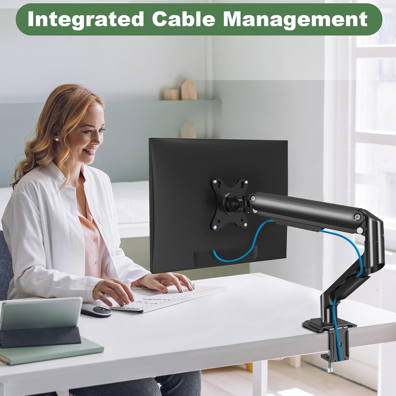 Clutter-Free Desktop: The monitor desk mount is lifted higher off the desktop, effectively freeing up your valuable desk space compared to a monitor stand with large base. The integrated cable management system easily routes messy power cords/cables to keep your desk area clean and organized