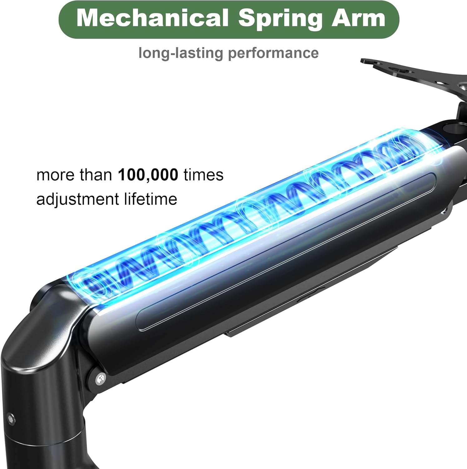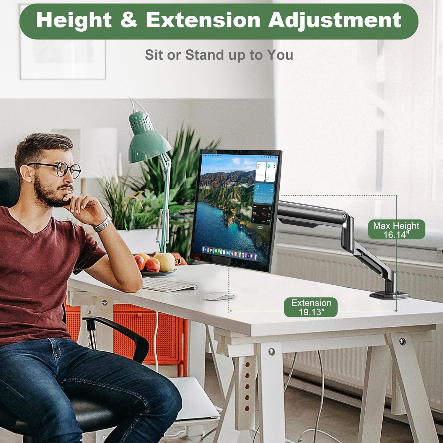 Farther & Higher Extension: Thanks to the improved mechanical spring mechanism, our single monitor mount boasts a long-lasting performance to hold monitor screen in place. The monitor arm can be extended forward up to 19.13″ and adjusted to a maximum height of 16.14″, making it a great addition to your standing/sitting desk setup