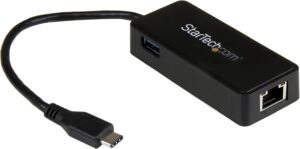 Add a Gigabit Ethernet network connection to your computer through a USB Type-C port Works with the newest MacBook, Chromebook Pixel™and other laptop and desktop computers with a USB-C port Thunderbolt 3 port compatible Add a USB Type-A port to your computer for connecting an additional peripheral device Native driver support in Chrome OS™ and Windows® 8.1 for easy set-up Supports Mac OS 10.10 with driver installation Powered directly from the USB port Compact, lightweight design for maximum portability Supports 10/100/1000 Mbps auto-detection IEEE 802.3, 802.3u and 802.3ab compatible IEEE 802.1Q VLAN Tagging support Built-in Checksum and Large Send Offload Up to 4K Jumbo Frame support Wake-On-LAN support IEEE 802.3az Energy Efficient Ethernet support CONNECTIVITY TOOLS: Provided with this device, the application improves performance and security, featuring MAC Address Changer & Wi-Fi Auto Switch utilities Now, you can easily connect to a Gigabit network through the USB-C™ or Thunderbolt™ 3 port on your laptop or desktop computer, and add connectivity for an additional USB (Type-A) peripheral device. It’s a great companion for your MacBook, Chromebook Pixel™, Dell™ XPS 12, Dell Latitude 12 7000 Series 2-in-1 or other devices. The USB-C network adapter supports full Gigabit bandwidth by harnessing the performance of USB 3.1 Gen 1 (5 Gbps). You can quickly access very large files over the network at Gigabit speed. Get up and running quickly. Simply plug the adapter into the USB Type-C™ port on your laptop and connect to your network. The network adapter chipset provides native driver support in Chrome OS™ and Windows® 8.1, and supports Mac OSX (10.10) with driver installation. The USB-C connector is smaller and easier to use than previous USB connectors. It’s a reversible plug so you can connect to your devices with either side facing up, without frustration or the risk of port damage. With a compact design, this USB-C network adapter is as portable as your laptop, perfect for ultra-portable devices that have a USB-C port, such as the MacBook and Chromebook Pixel™. The network adapter is bus-powered which makes it easy to connect when you’re on the go. Some computers with USB Type-C only offer one port for external connectivity. This Ethernet adapter features a built-in USB Type-A port, giving you the freedom to attach an additional peripheral device, such as a USB mouse. Developed to improve performance and security, StarTech.com Connectivity Tools is the only software suite on the market that works with a wide range of IT connectivity accessories. The software suite includes: Mac Address Pass-Through Utility: To improve network security. Wi-Fi Auto Switch Utility: Enabling users to quickly access faster network speeds via wired LAN. For more information and to download the StarTech.com Connectivity Tools application, please visit: www.StarTech.com/Connectivity-Tools The US1GC301AU is backed by a StarTech.com 2-year warranty and free lifetime technical support. Add Gigabit Ethernet capabilities to your MacBook, Chromebook Pixel, Dell XPS 12 or Dell Latitude 12 7000 Series 2-in-1 Turn your USB-C port into a Gigabit LAN RJ45 port Add an extra USB peripheral along with your network adapter Specifications Warranty Information Warranty 2 Years Connector(s) 1 – Connector Type(s) USB Type-C (24 pin, 5Gbps) 1 – External Ports USB 3.1 Gen 1 USB Type-A (9 pin, 5 Gbps) RJ-45 Environmental Operating Temperature 0°C to 50°C (32°F to 122°F) Storage Temperature -10°C to 60°C (14°F to 140°F) Humidity 5% ~ 80% RH Hardware Ports 1 Interface RJ45 (Gigabit Ethernet) Bus Type USB 3.1 Gen 1 USB Pass-Through Yes Industry Standards IEEE 802.3, 802.3u and 802.3ab Chipset ID ASIX – AX88179 VIA/VLI – VL812 Indicators 1 – LED Indicators Green: 10/100 Link/Activity Amber: Gigabit Link/Activity Packaging Information Package Height 1.2 in [3.0 cm] Package Length 6.7 in [17.0 cm] Shipping (Package) Weight 3.2 oz [92.0 g] Package Width 5.6 in [14.3 cm] Performance Maximum Data Transfer Rate 5 Gbps (USB 3.1 Gen 1) Type and Rate USB 3.1 Gen 1 – 5 Gbit/s Compatible Networks 10/100/1000 Mbps Auto MDIX Yes Full Duplex Support Yes Jumbo Frame Support 4K max. Physical Characteristics Product Length 10.8 in [27.5 cm] Form Factor Attached Cable Weight of Product 1.3 oz [38.0 g] Color Black Material Plastic Cable Length 8.0 in [20.3 cm] Product Width 1.4 in [3.5 cm] Product Height 0.7 in [1.7 cm] Power Power Source USB-Powered Software OS Compatibility Windows® XP, Vista, 7, 8, 8.1, 10, 11 Windows Server® 2003, 2008 R2, 2012 macOS 10.6 to 10.15, 11.3 and up VLAN tagging is currently not supported in macOS Linux Kernel 2.6.25 to 4.11.x LTS Versions only What’s in the Box 1 – Included in Package USB-C to GbE Network Adapter