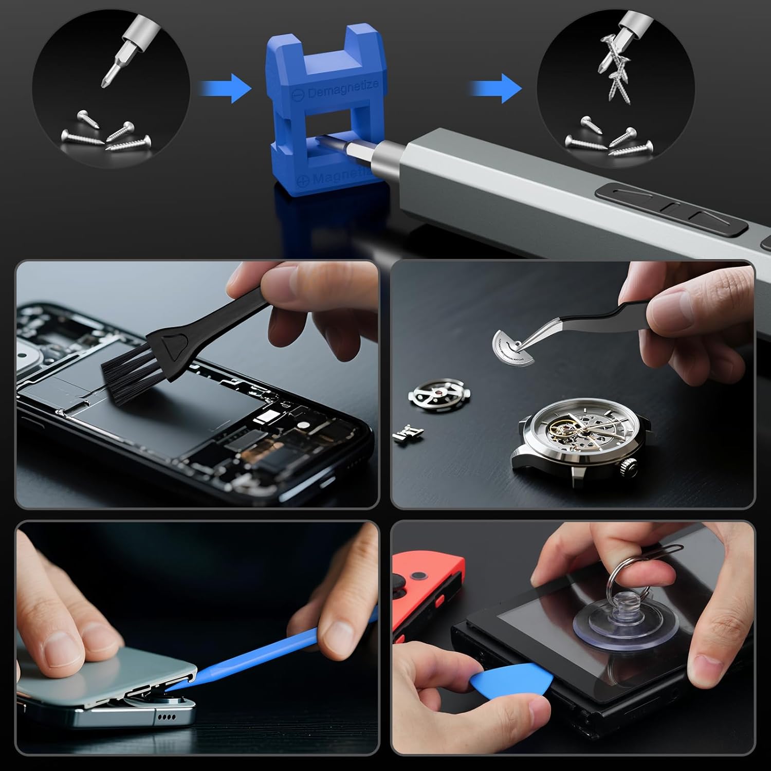 【Magnetic Design】We have added 2 magnetic tools in this mini electric screwdriver set to save your time and energy, making your fixing job easier. The magnetizer demagnetizer tool helps strengthen the magnetism of the screwdriver tips to grab screws, or weaken it to avoid damage to your sensitive electronics. The 5.7 x 3.3″ magnetic project mat keeps all micro screws and parts organized, preventing loss and mess