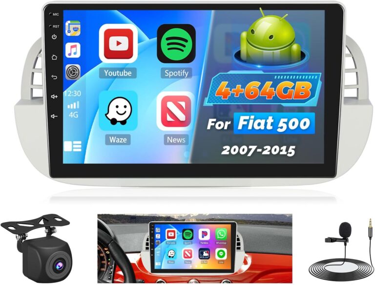 Android 15 Car Stereo for Fiat 500 2007-2015, 9″ HD Touchscreen for Fiat 500 Radio Upgrade, Wireless CarPlay/Android Auto, 5G WiFi GPS Bluetooth 5.0 1280 * 720 Resolution 4+64 G