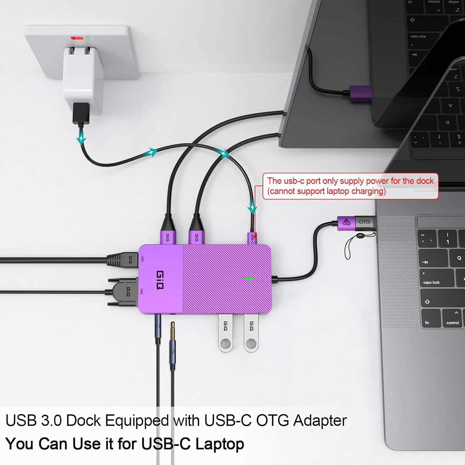 USB-C Hub: GIQ macbook adapter with HDMI make it possible for you to connect to a display screen or TV for vivid video output.With 3*USB Port, you can charge devices, connect external hard drive also keyboard and mouse. There is also a 1000Mbps Gigabit RJ45 ethernet port, TF and micro SD card readers. All hub ports can work simultaneously, small yet mighty.The USB-C port is design for our usb docking station charging only(not support charging for laptop).
