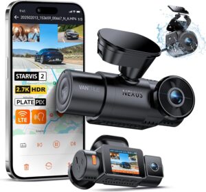 ( STARVIS 2, HDR & IR Night Vision Dash Camera ) Experience unparalleled night vision clarity with advanced STARVIS 2 and HDR technology across all 3 cameras. Every critical detail is captured with exceptional clarity based on superior light sensitivity. The front camera integrates Vantrue’s exclusive PlatePix technology, boosting license plate recognition by 1.5X for undisputable evidence. while 4 IR lights deliver crystal-clear cabin footage even indark night. Perfect for late-night drivers.