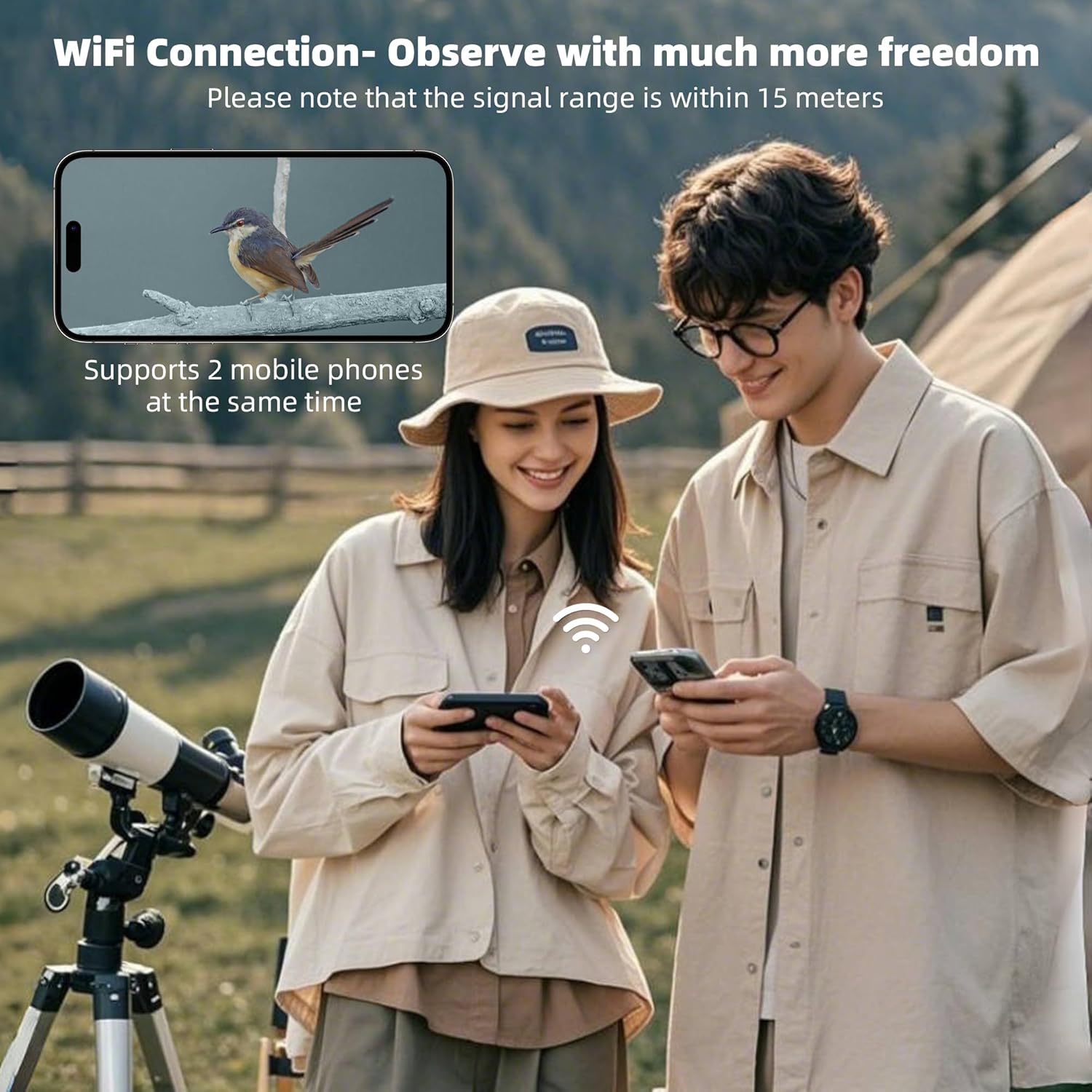 64G Storage & App- Powered: Paired with a 64G TF card, the astronomy camera supports max 256G. And you can observe and record your aims through easy WiFi connection to the proprietary app, saving stimulating frames in your phone album and share them with friends at any time, which achieves multi channel storage