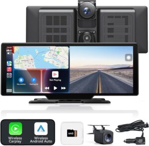 【4K Front + 1080P Rear Dual Cam Loop Recording】: Our portable car play screen features dual-channel recording with a 4K front camera and 1080P rear backup cam, capturing crisp footage of road conditions and surroundings. This carplay screen supports loop recording, video playback on smartphones, and includes a 64GB TF card for storage. Enhanced safety with split-screen views while reversing.