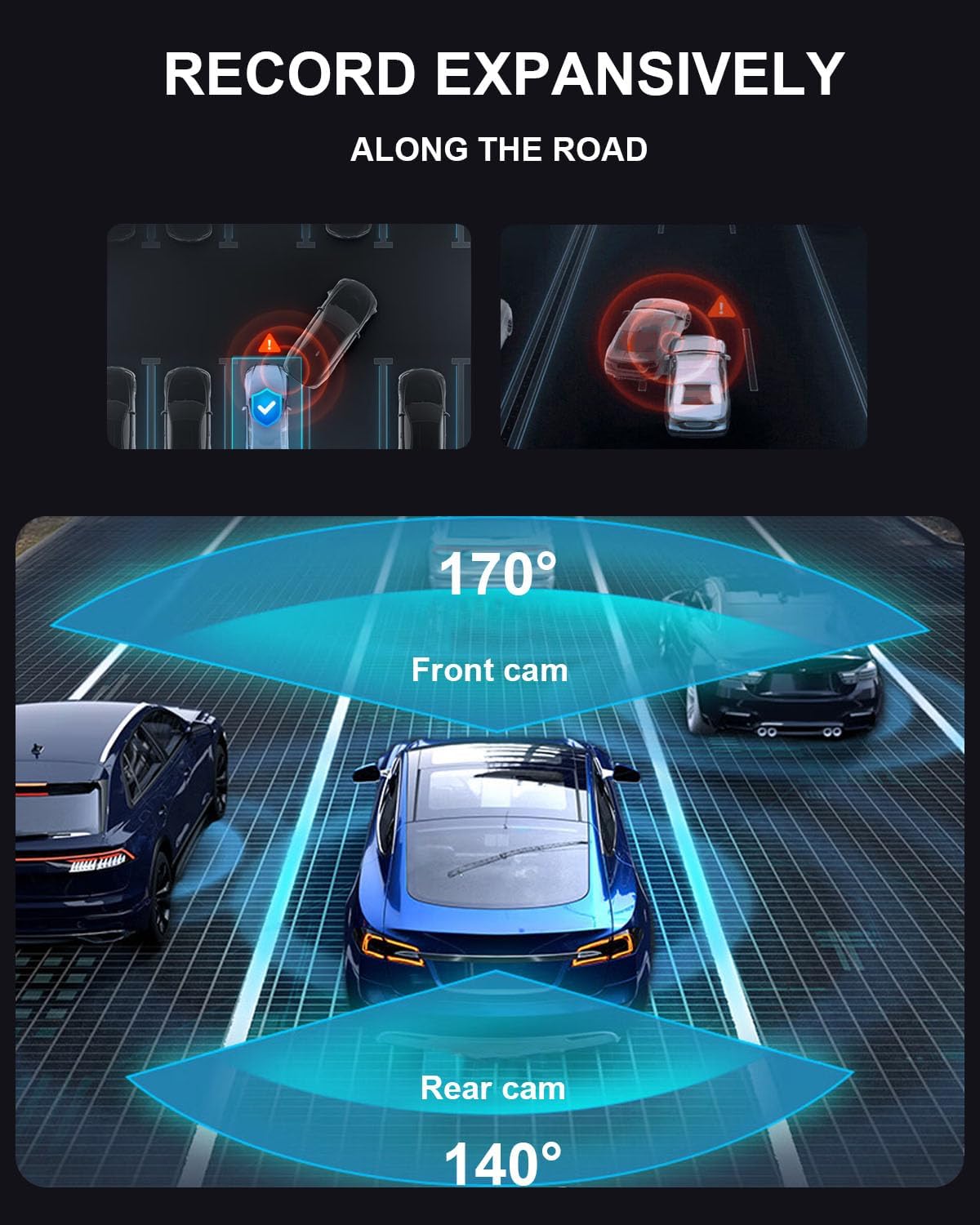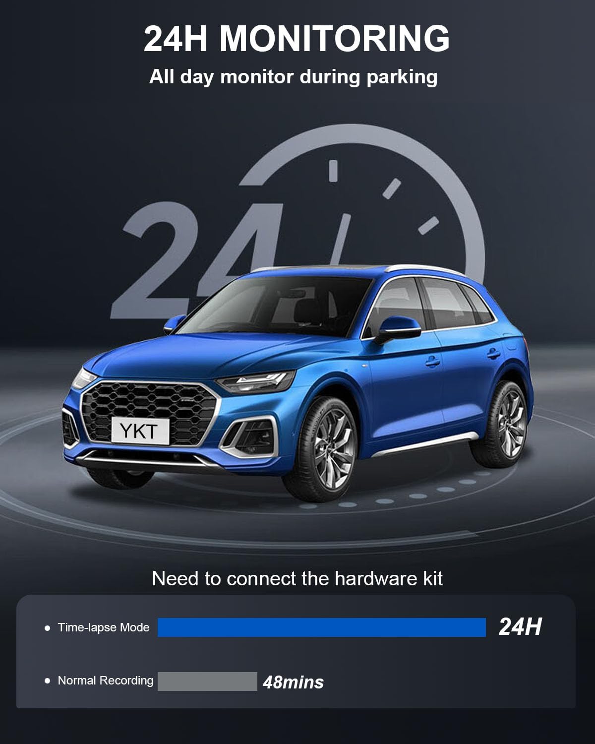 24-Hours Parking Monitor – Beyond on-the-road safety with loop recording, the dash camera also features a 24-hours parking monitor. Time-lapse mode records at a low frame rate to conserve power and storage while ensuring continuous surveillance of your vehicle. (A hardwire kit is required for parking monitoring.)