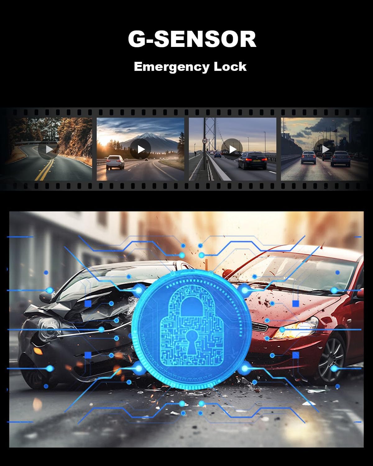 Loop Recording, G-SENSOR – Loop recording of the mirror dash cam front and rear will automatically overwrite the old files when the card is full. G-sensor detects a sudden collision and locks the collision footage, so the rearview mirror camera won’t overwrite locked files